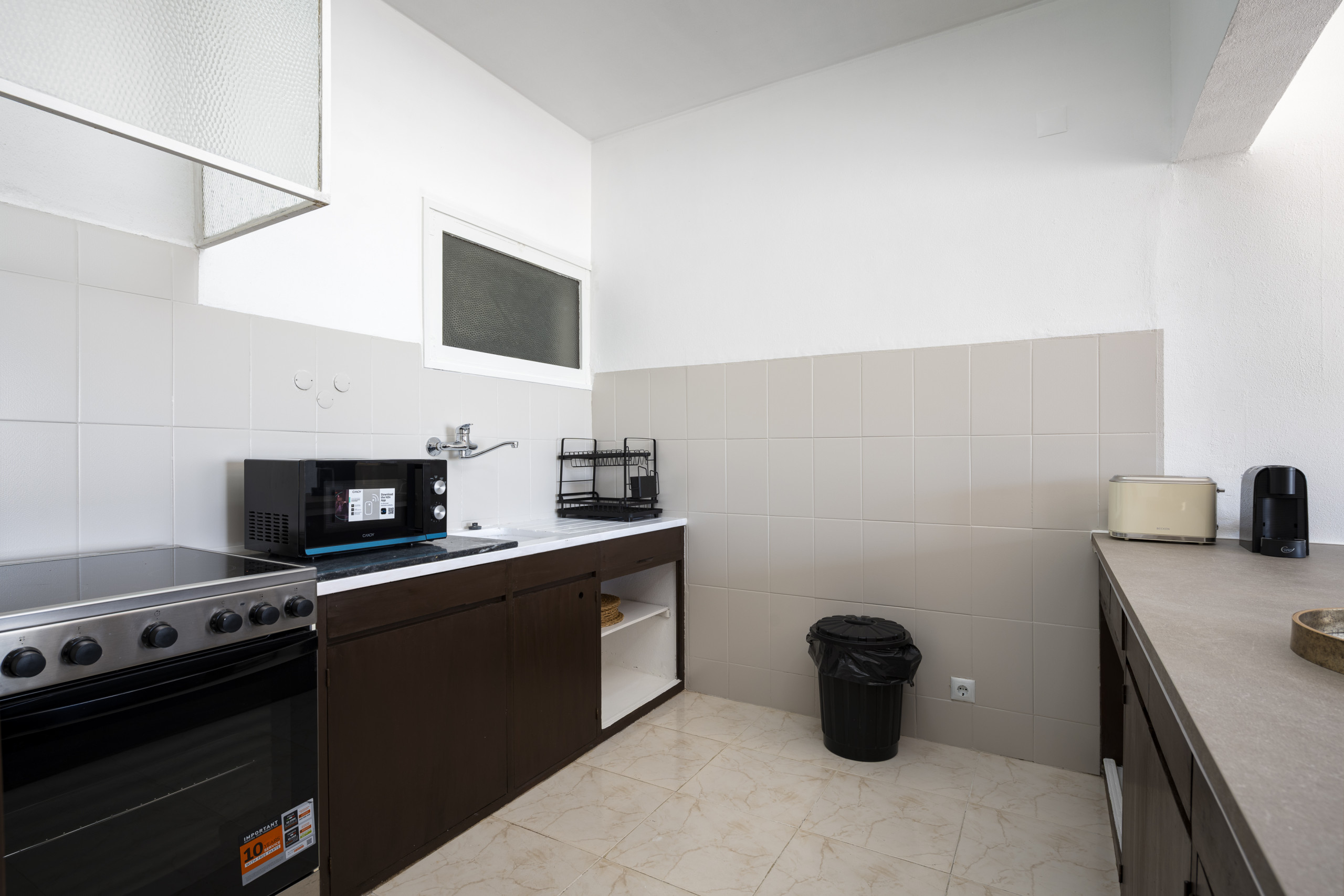 A kitchenette, de inducção, está equipada com frigorífico, microondas, congelador, máquina de lavar roupa, louça/talheres, utensílios/cozinha, torradeira e jarro eléctrico.
