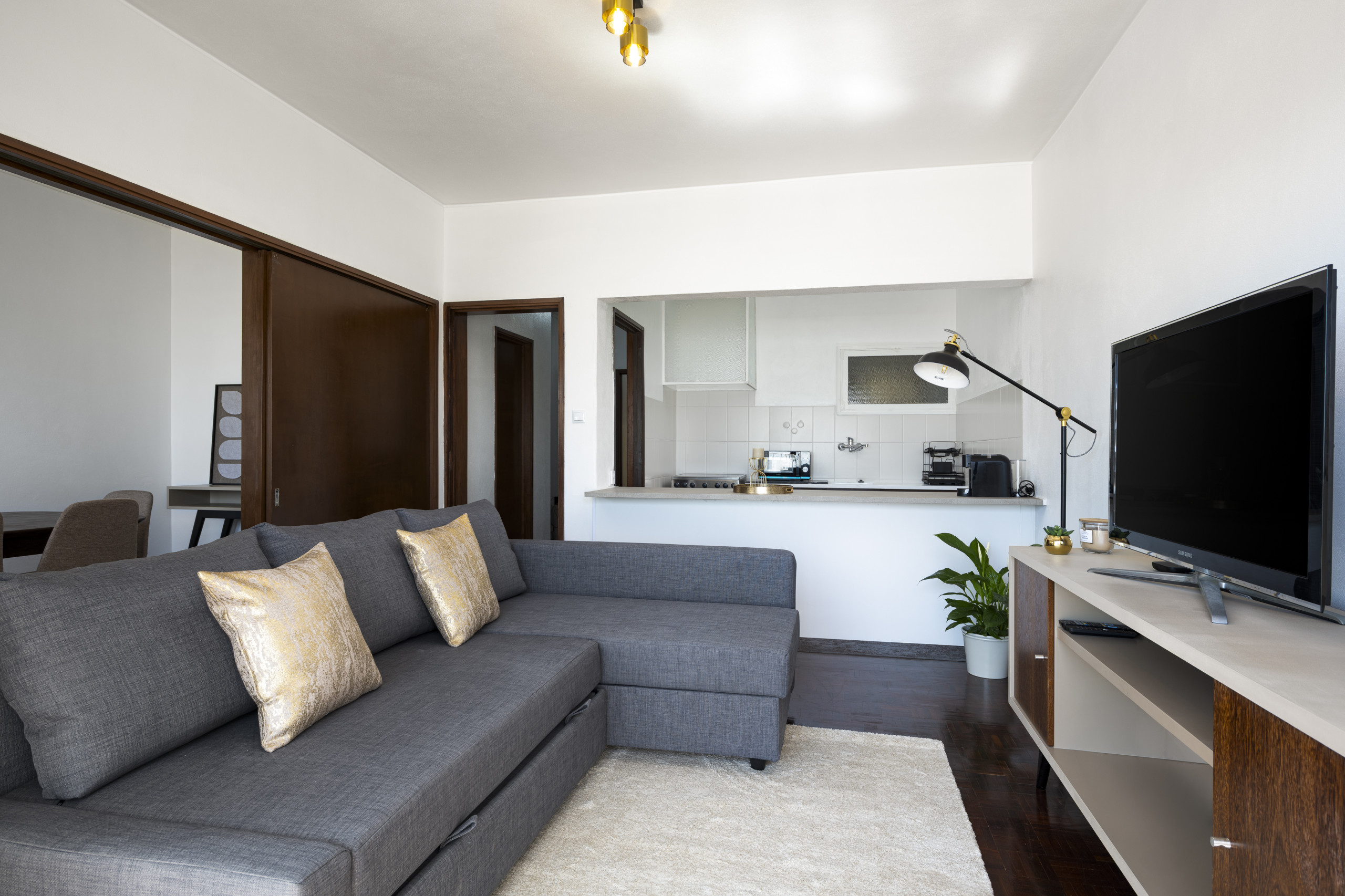 O espaço conta com dois quartos confortáveis, incluindo uma cama de casal e duas camas individuais, além de um sofá-cama para acomodar todos os hóspedes com facilidade. A sala de estar dispõe de ar condicionado para garantir o máximo conforto em dias mais quentes, criando um ambiente agradável para descansar e conviver.