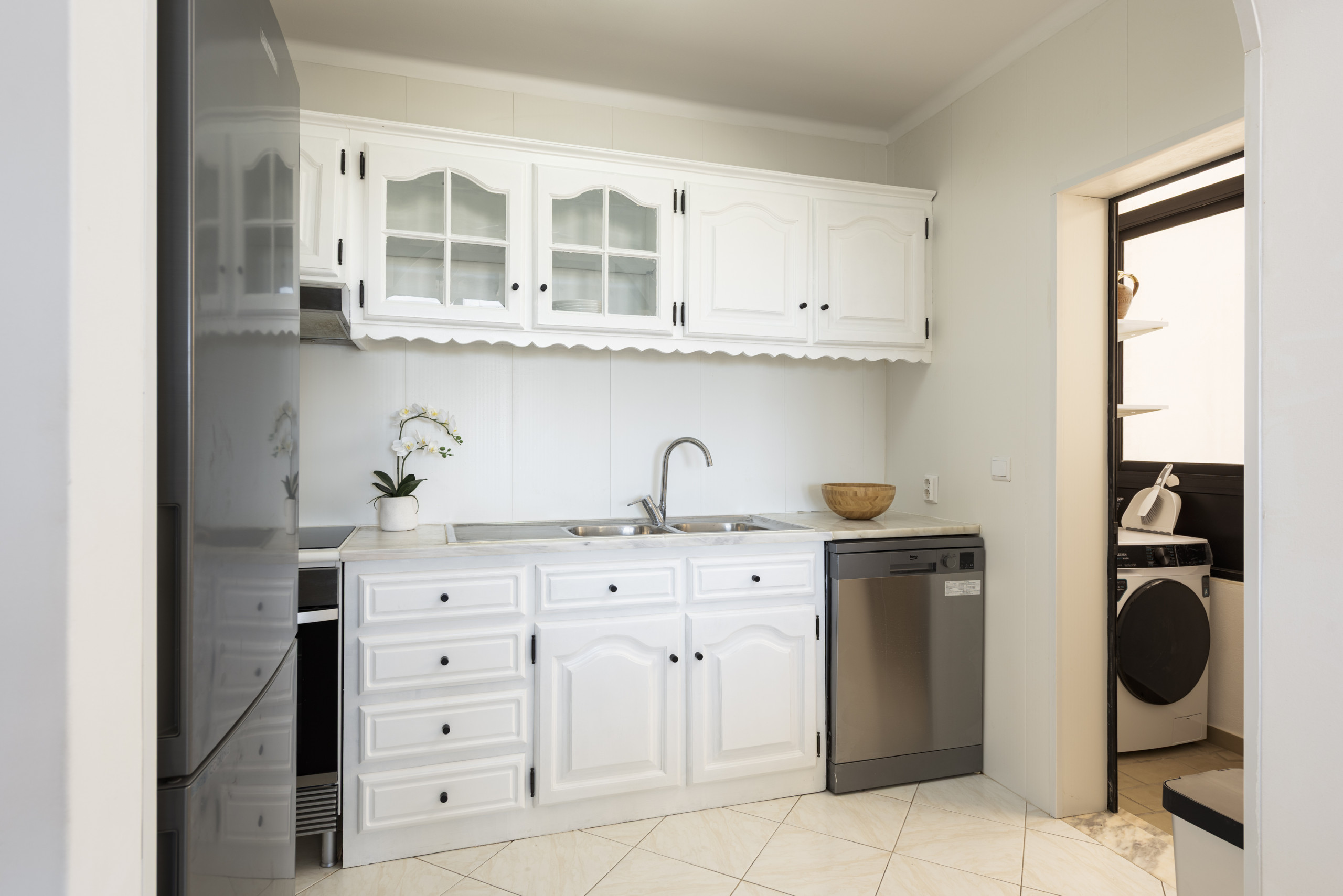 A kitchenette, de inducção, está equipada com frigorífico, forno, congelador, máquina de lavar louça, louça/talheres e utensílios/cozinha.