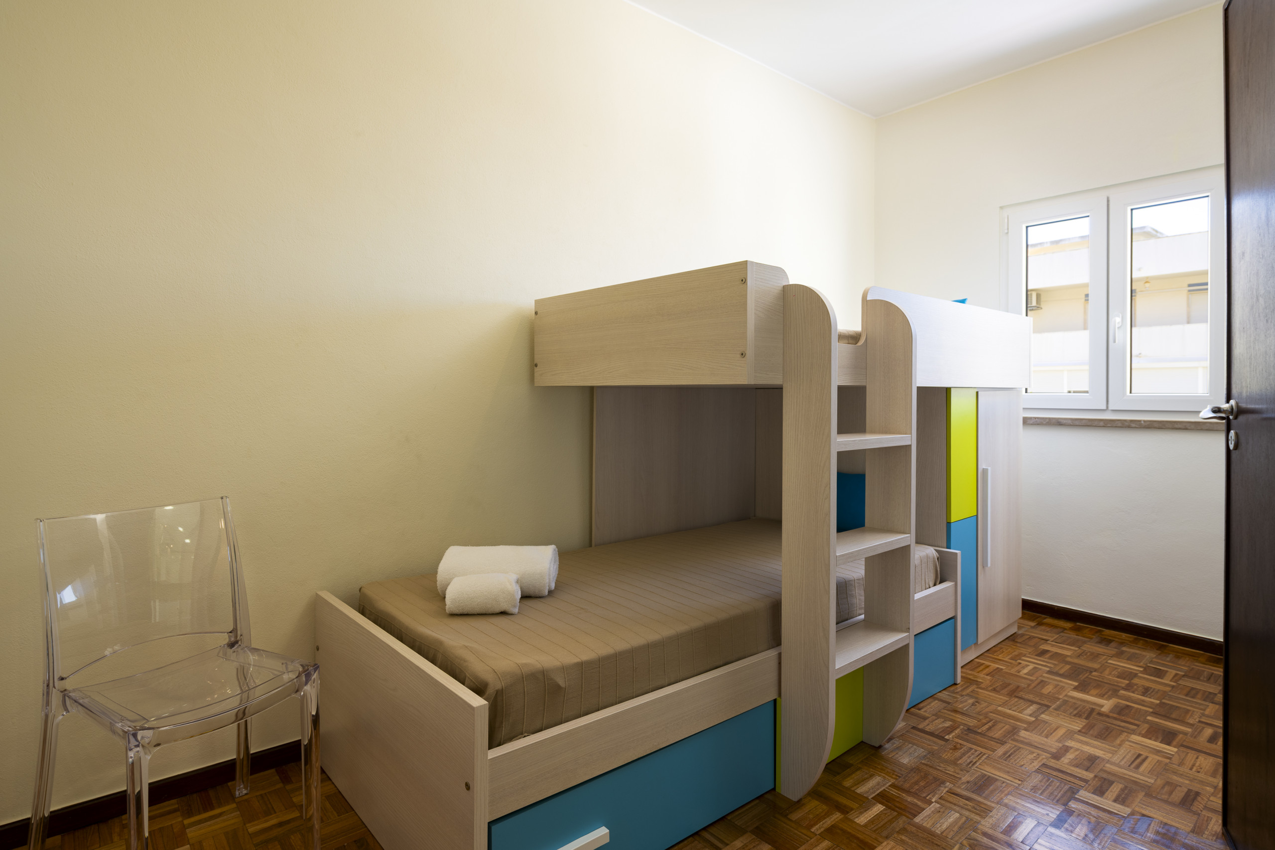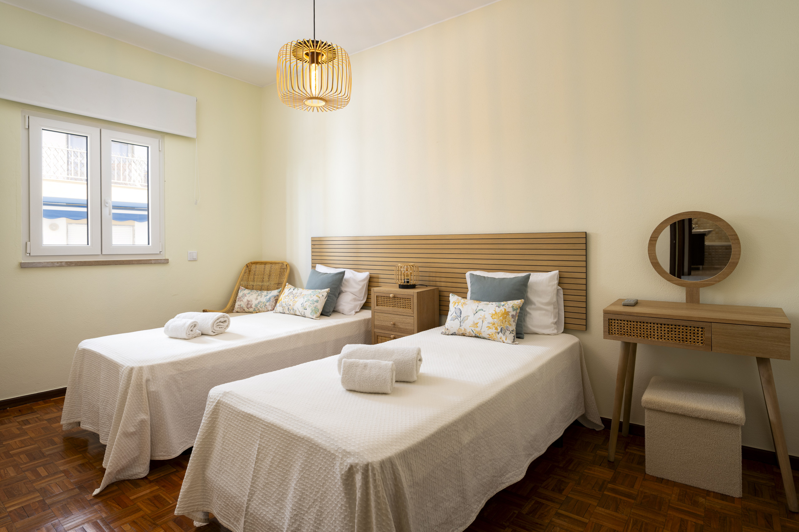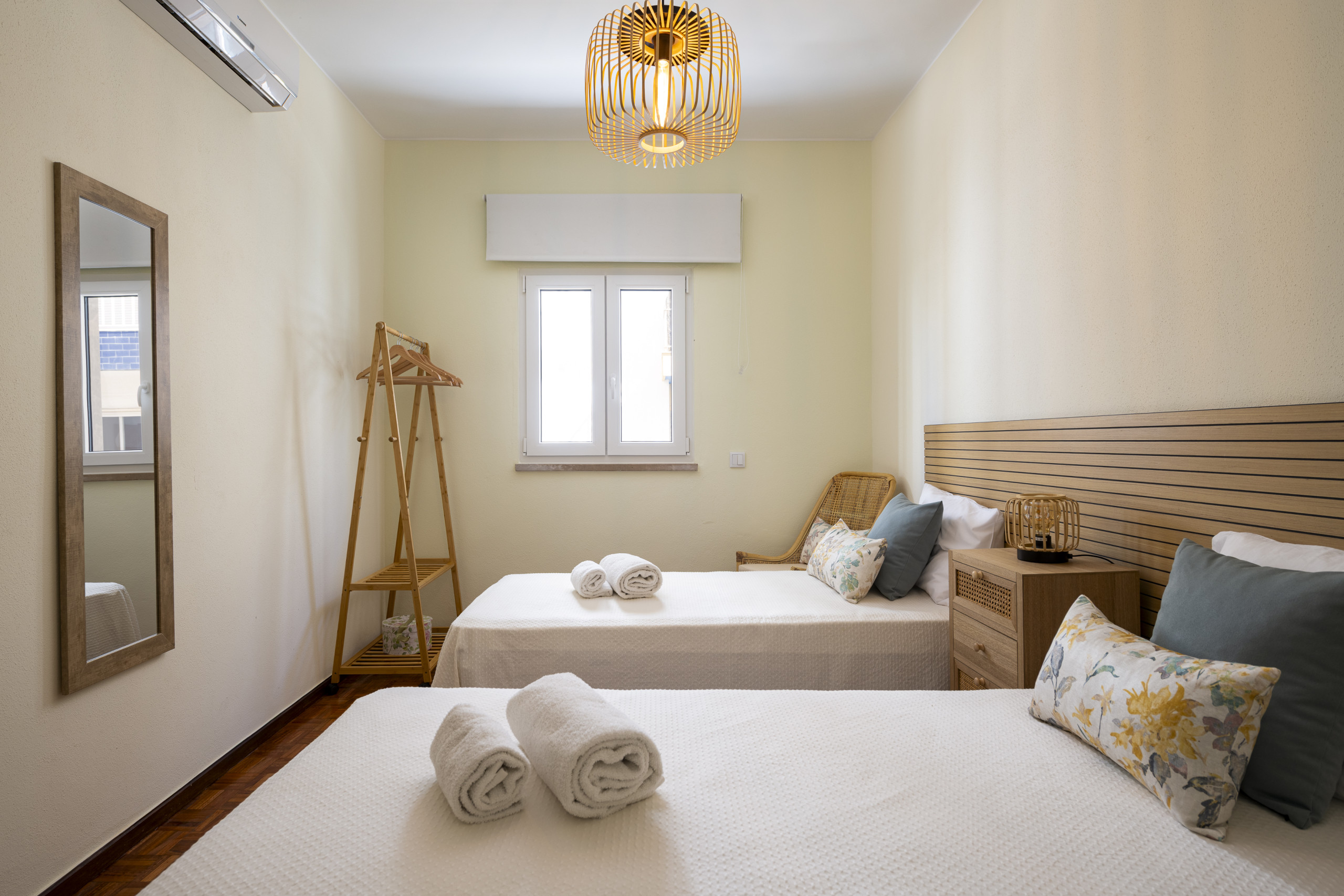 O apartamento dispõe de 4 quartos aconchegantes e 2 casas de banho completas. Tens à tua disposição 7 camas confortáveis - 1 cama de casal e 6 camas individuais - garantindo um descanso tranquilo para toda a família. A varanda oferece um espaço perfeito para relaxar e apreciar o ambiente envolvente.