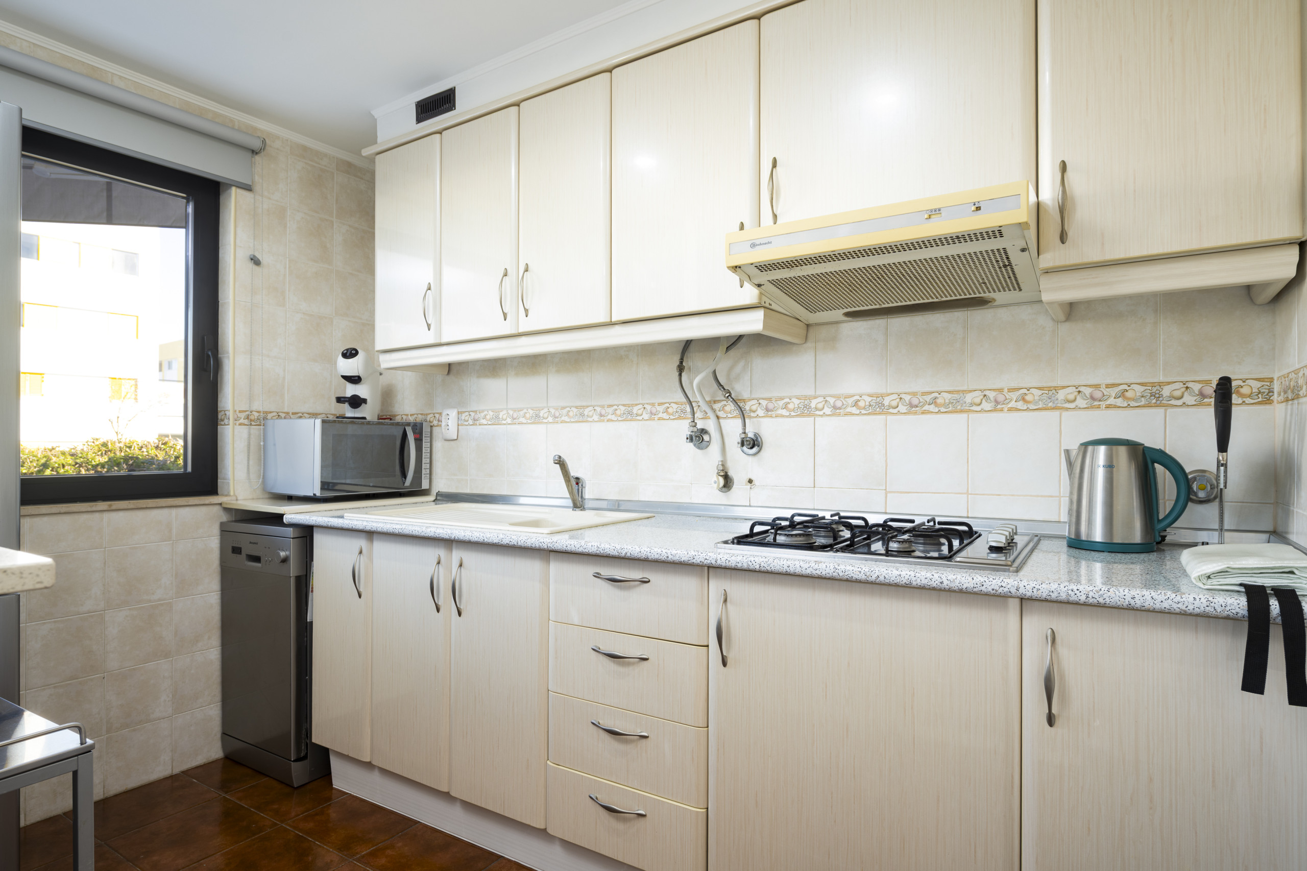 A kitchenette, de gás, está equipada com frigorífico, microondas, forno, congelador, máquina de lavar louça, louça/talheres, utensílios/cozinha, máquina de café, torradeira e jarro eléctrico.