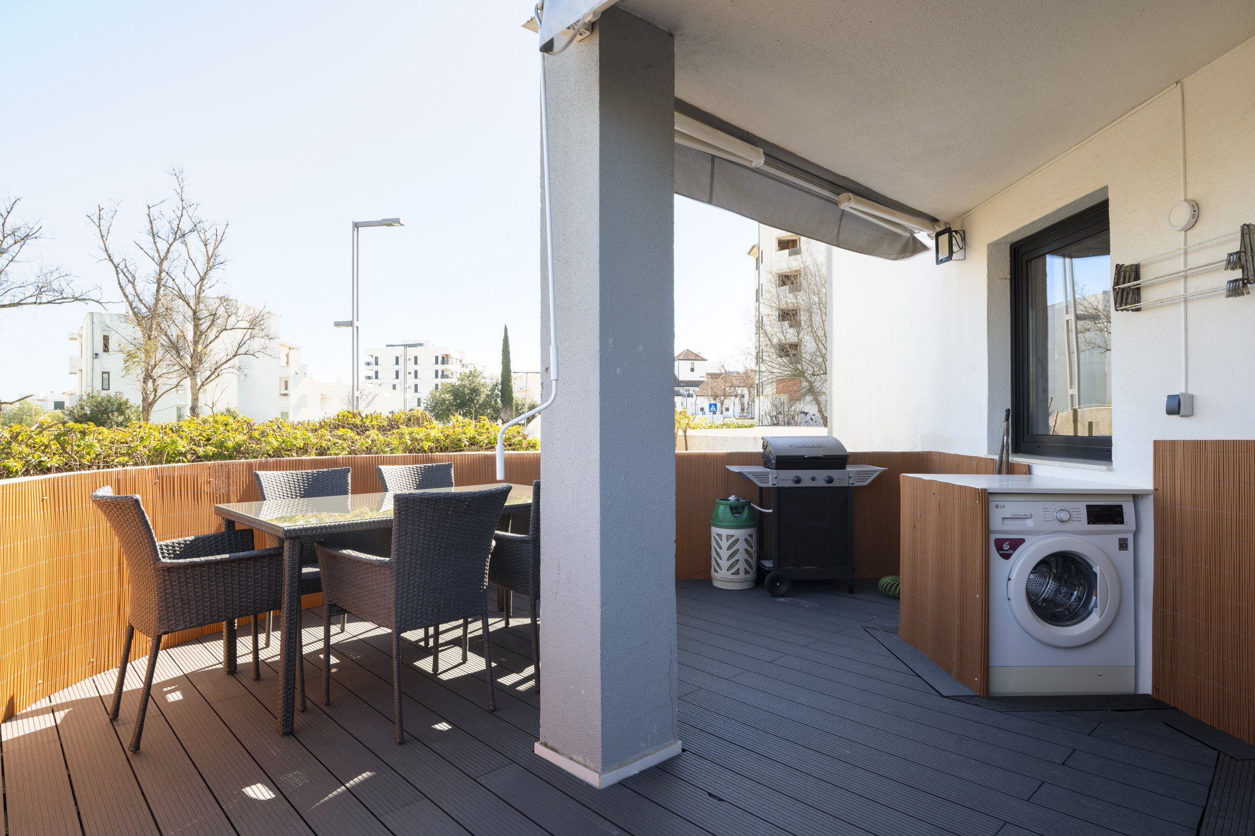 Dispõe de elevador, mobiliário de jardim, terraço, máquina de lavar roupa, churrasqueira, ferro de engomar, acesso internet (wifi), secador de cabelo, ar-condicionado, piscina comunitária+infantil, garagem no mesmo edifício, 1 Televisão, tv satélite.