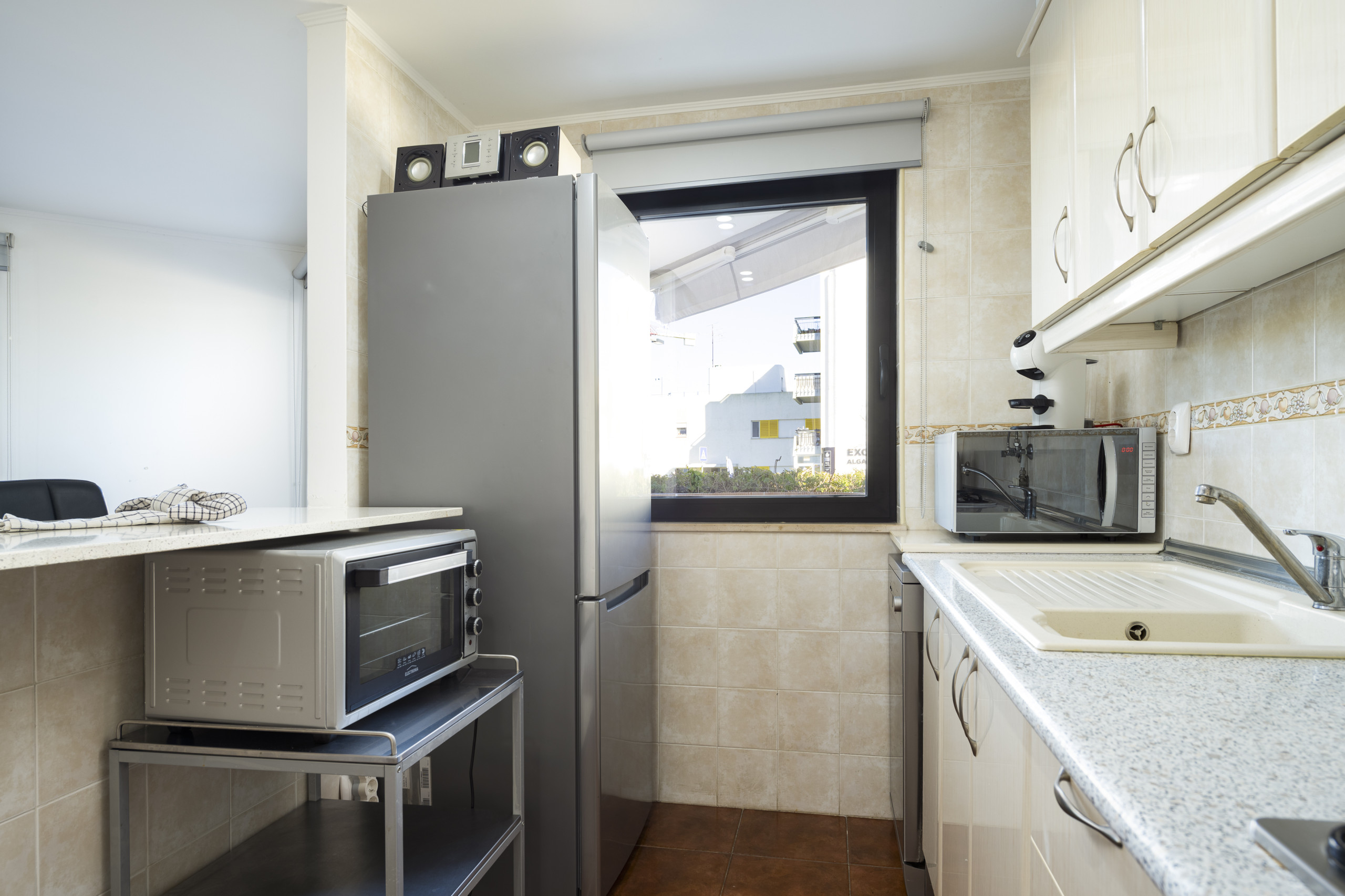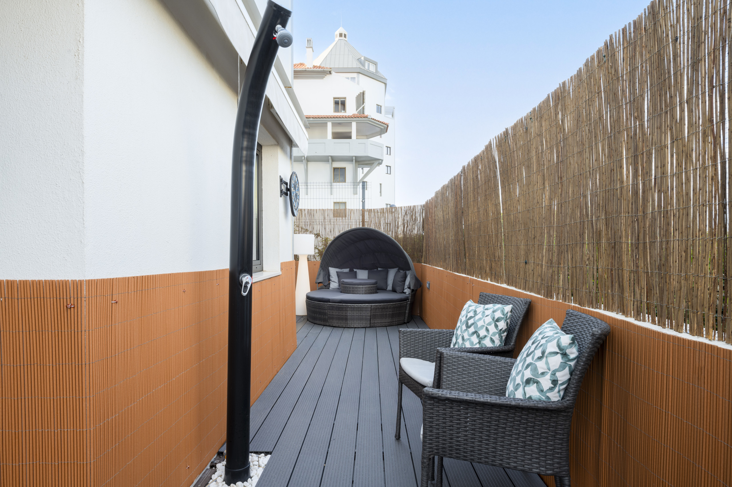 A cozinha americana totalmente equipada permite-te preparar refeições deliciosas, com eletrodomésticos modernos como frigorífico, máquina de lavar, forno, máquina de café e todos os utensílios necessários. O ar condicionado em todo o apartamento assegura o teu conforto, independentemente da temperatura exterior.