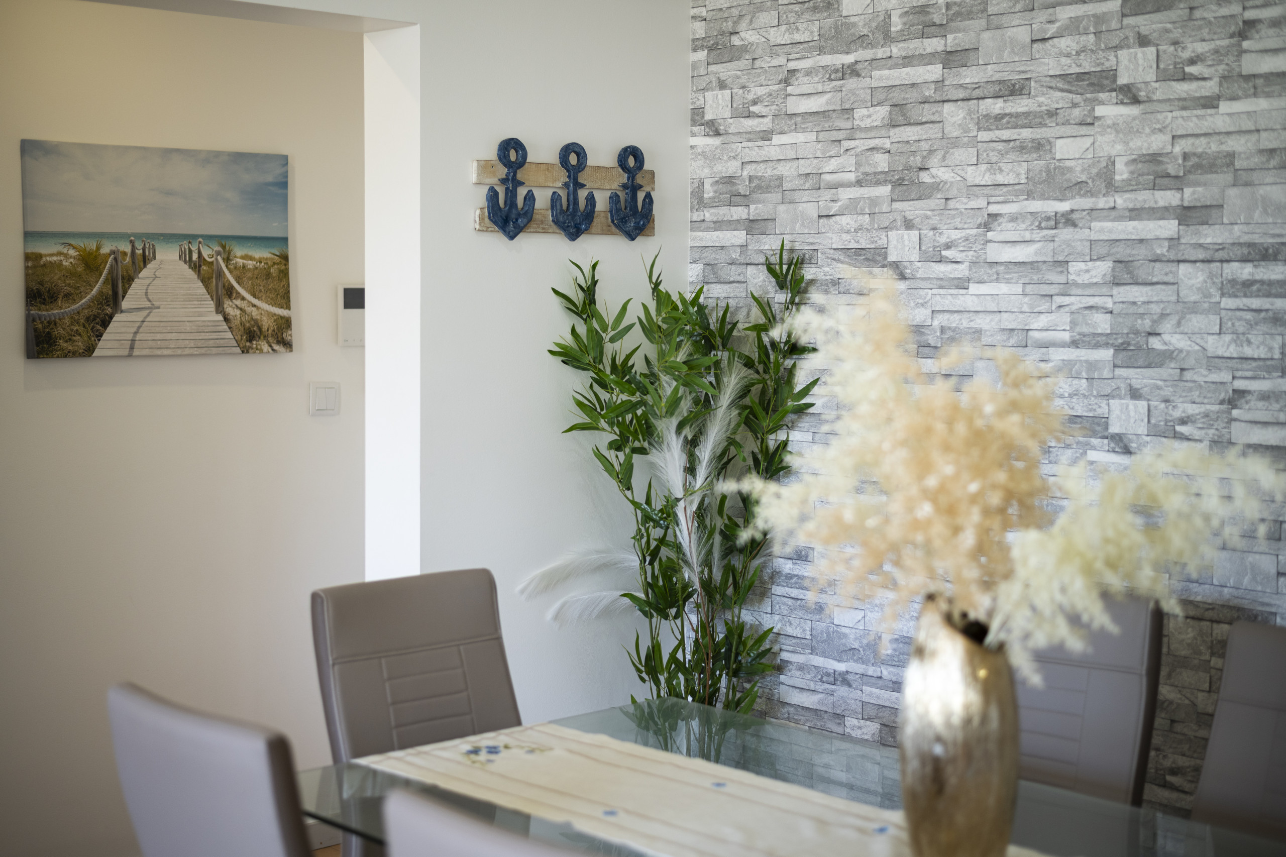 The apartment features a bedroom with a double bed and a sofa bed, offering flexibility for different sleeping configurations. The living room is equipped with air conditioning to ensure maximum comfort throughout the year. The fully equipped kitchen is a true strong point, with modern appliances such as a washing machine, refrigerator, dishwasher, oven, microwave, coffee machine, and much more.